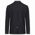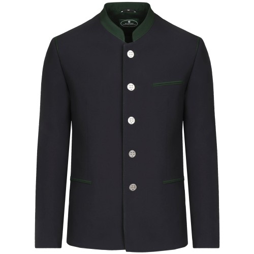 Wyjątkowa marynarka garniturowa od jednego z najbardziej cenionych austriackich producentów, inspirowana klasycznym rzemiosłem i tradycyjnym stylem alpejskim. Uszyta z lekkiej, garniturowej tkaniny wykonanej z wełny dziewiczej w eleganckim odcieniu granatu, zachwyca dopracowanymi detalami i ponadczasową estetyką. Postarzane, srebrzyste metalowe guziki i zielona stójka podkreślają jej charakter. Zielone obszycia zdobią kieszenie, listwę guzikową, środkowy szew na plecach oraz zapinany na guzik dragon z tyłu marynarki, a szwy na mankietach i ramionach wykończone są delikatną zieloną wypustką. Całość dopełnia pełna podszewka z zielonej wiskozy oraz dwie wewnętrzne kieszenie umieszczone na piersiach. Elegancja, tradycja i jakość w najlepszym wydaniu.