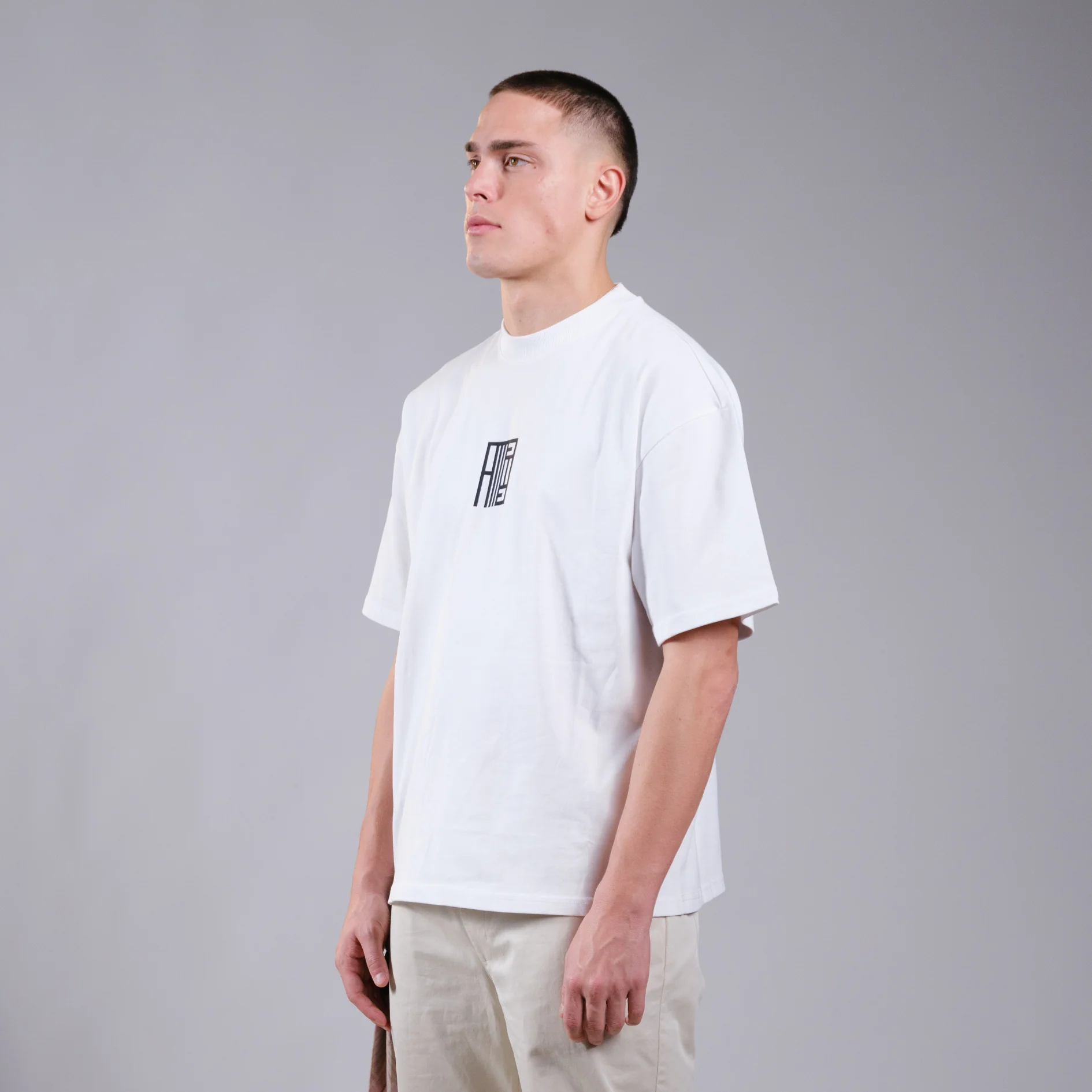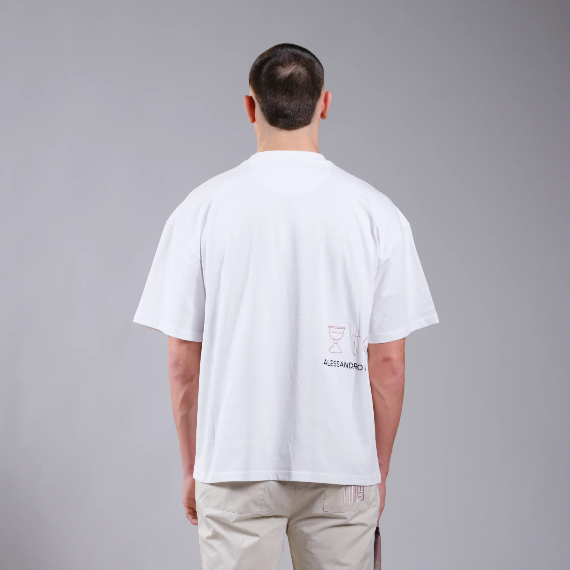Biała koszulka oversizowa, na środku posiada logo firmy ALESSANDRO MAGNO.