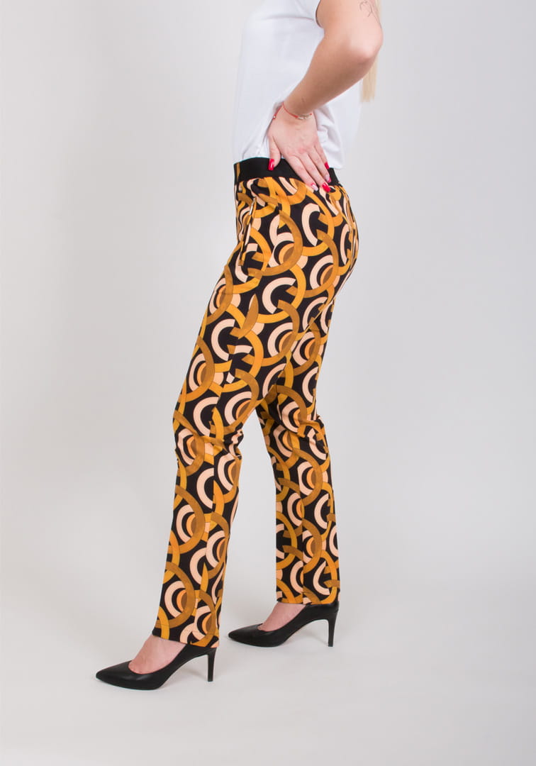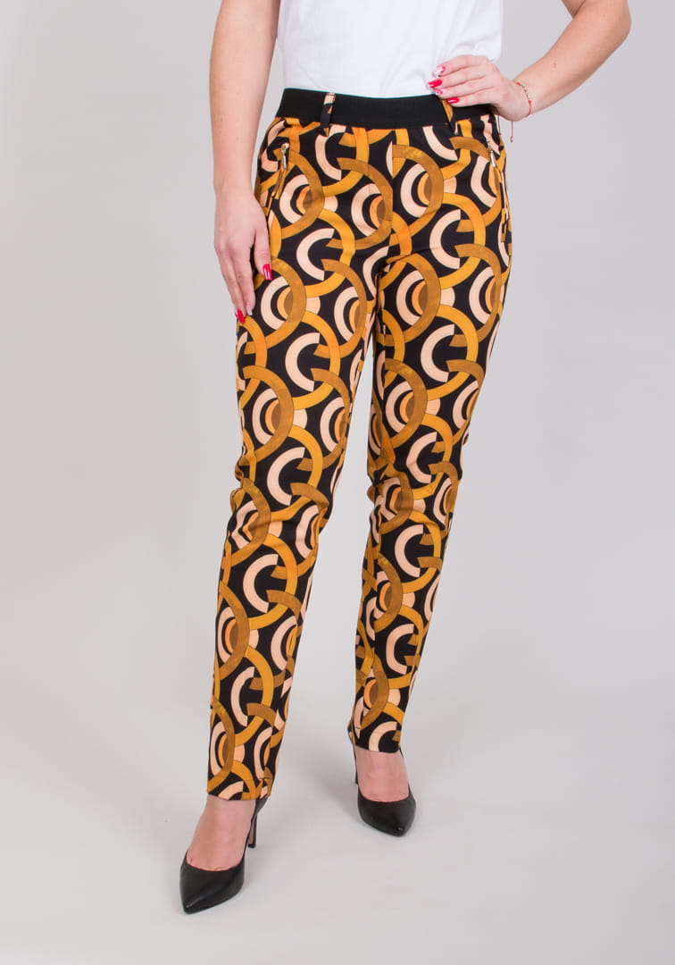 Spodnie EMMA w kolorze czarnym w żółte wzory. Klasyczne spodnie o wygodnym kroju, wykonane z przyjemnego materiału. Doskonałe dopasowanie oraz wysoka jakość wykonania zapewniają komfort i swobodę ruchu.