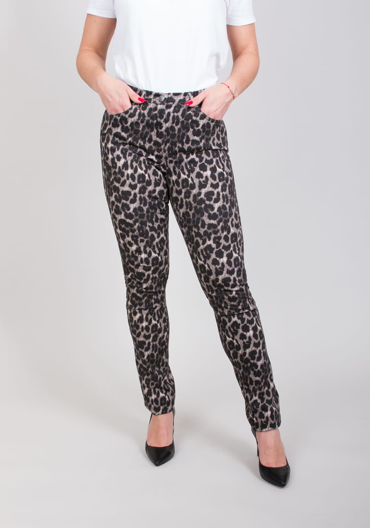 Spodnie MONI w panterkę. Modne spodnie, elastyczny materiał i wygodny krój zapewniają niebywały komfort noszenia i swobodę ruchu. Spodnie idealnie się dopasowują poprzez bardzo elastyczną tylną część spodni, którą zapewnia ściągacz w tylnej części paska. Trwałość kolorów tkaniny gwarantuje długą żywotność i elegancki wygląd.
