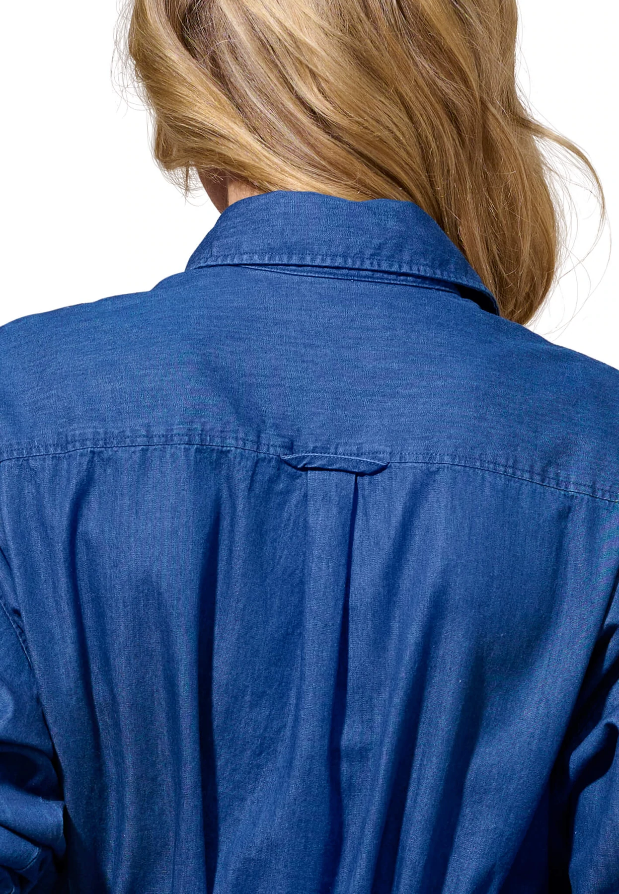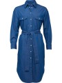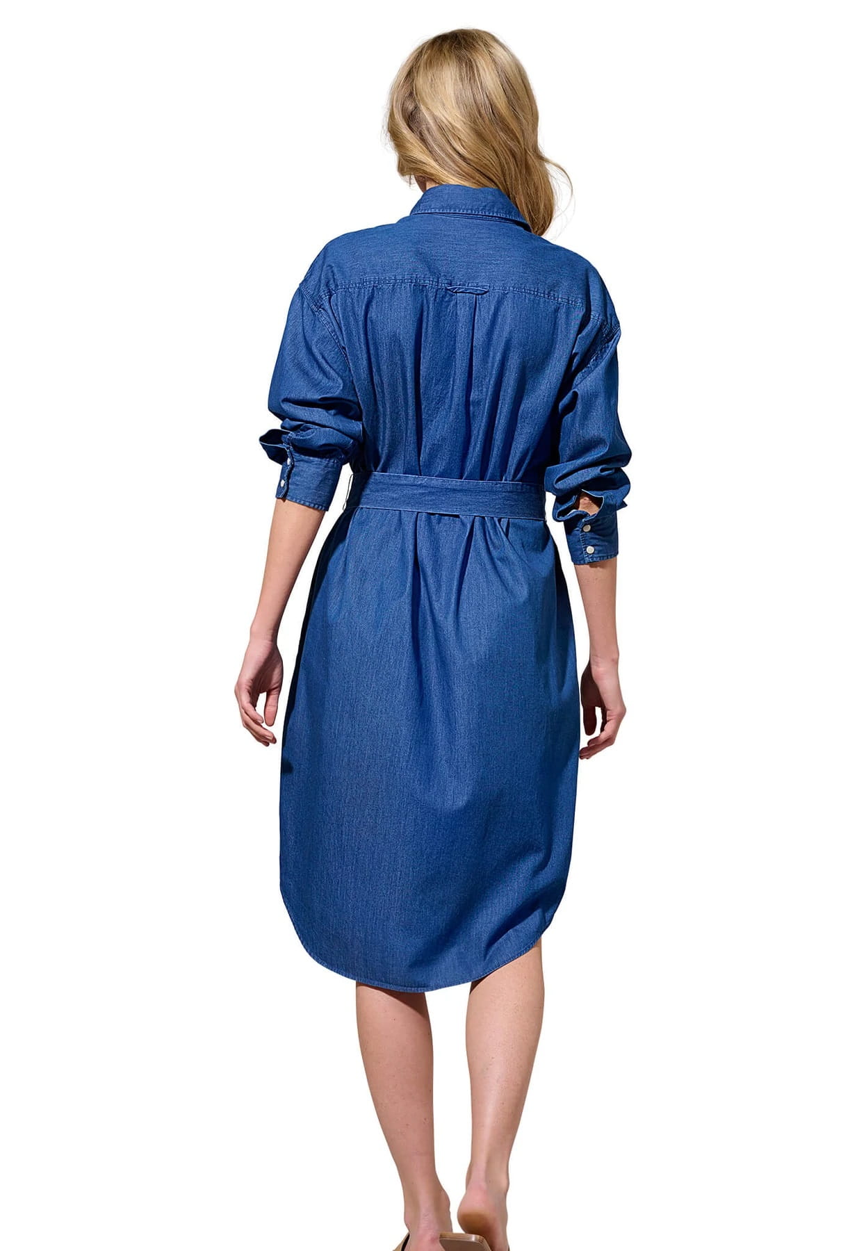 Sukienka firmy Fynch-Hatton z paskiem w kolorze niebieskiego jeansu. Wygodna, koszulowa sukienka łącząca klasyczny styl jeansowy z kobiecą sylwetką. Klasyczny kołnierzyk, zapięcie na całej długości na zatrzaski oraz zaokrąglone brzegi nadają sukience uroku oraz lekkości. Ta uniwersalna i wszechstronna sukienka, którą można nosić na wiele sposobów doskonale wpisuje się w letnie, urlopowe klimaty.