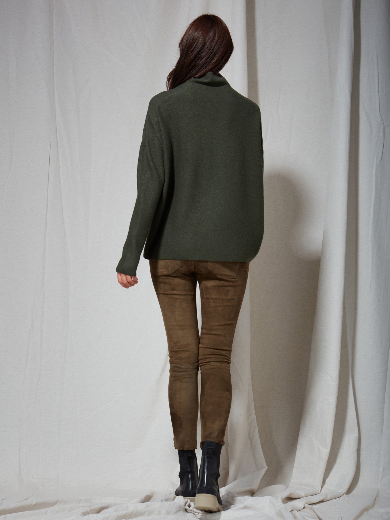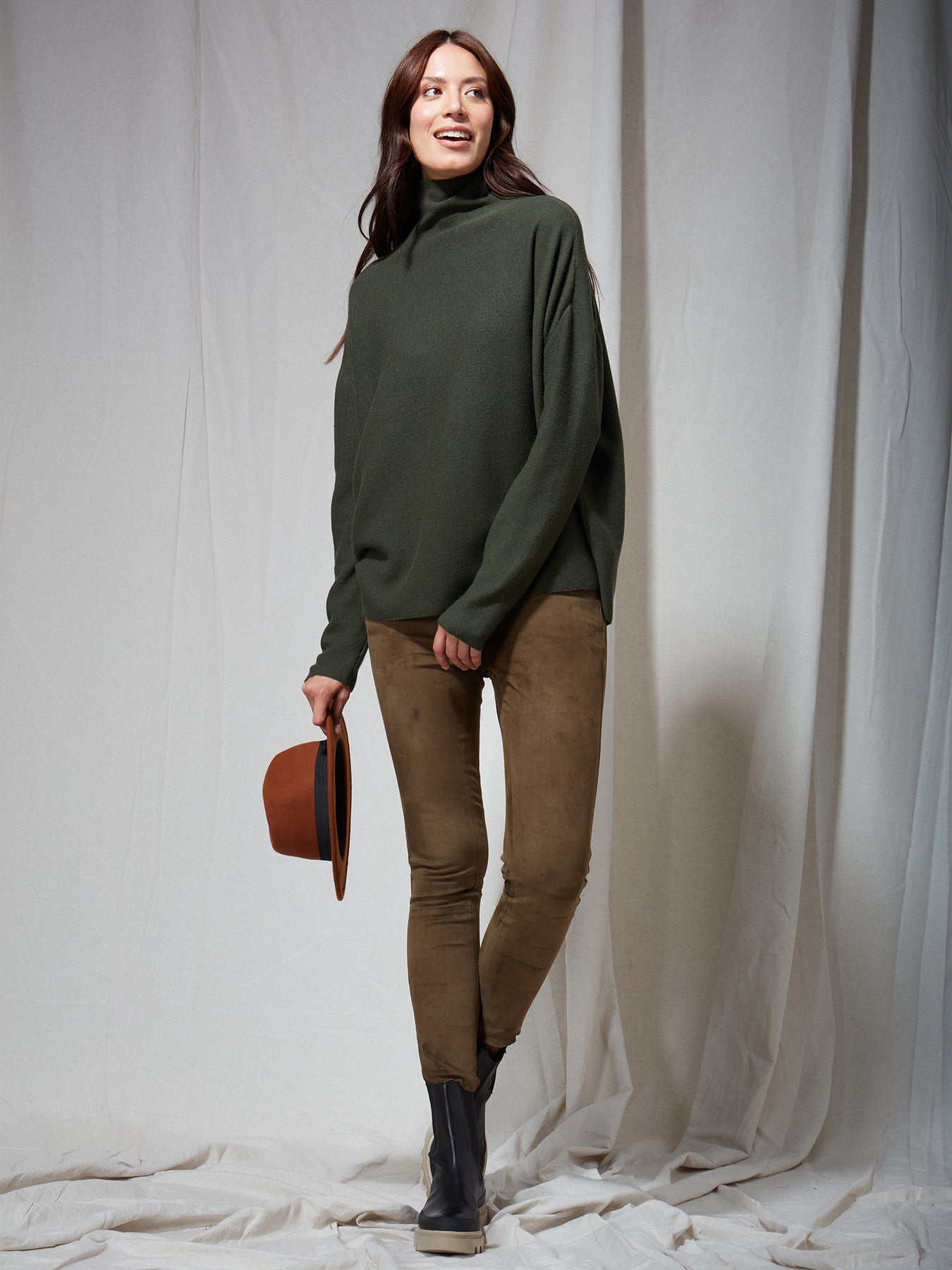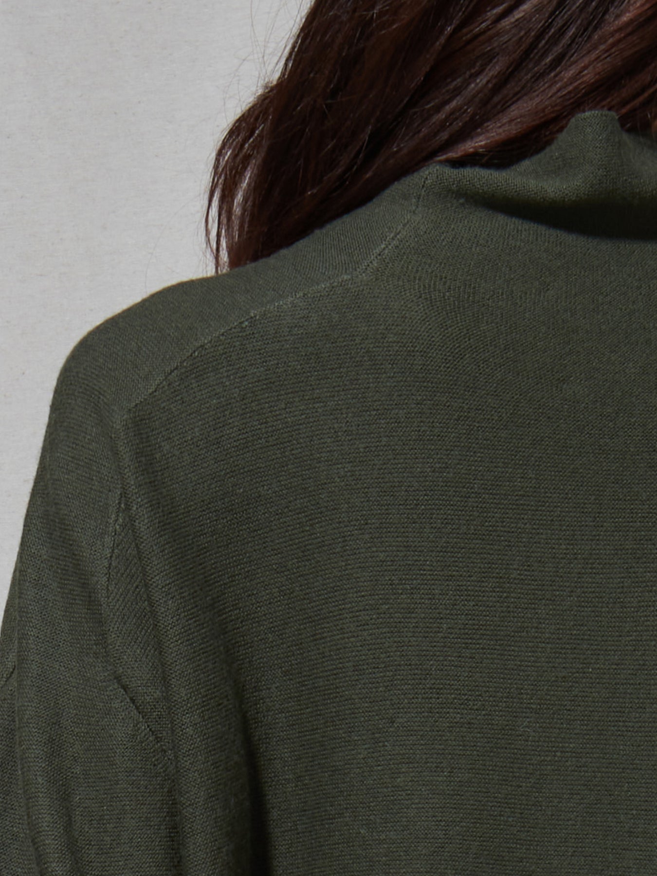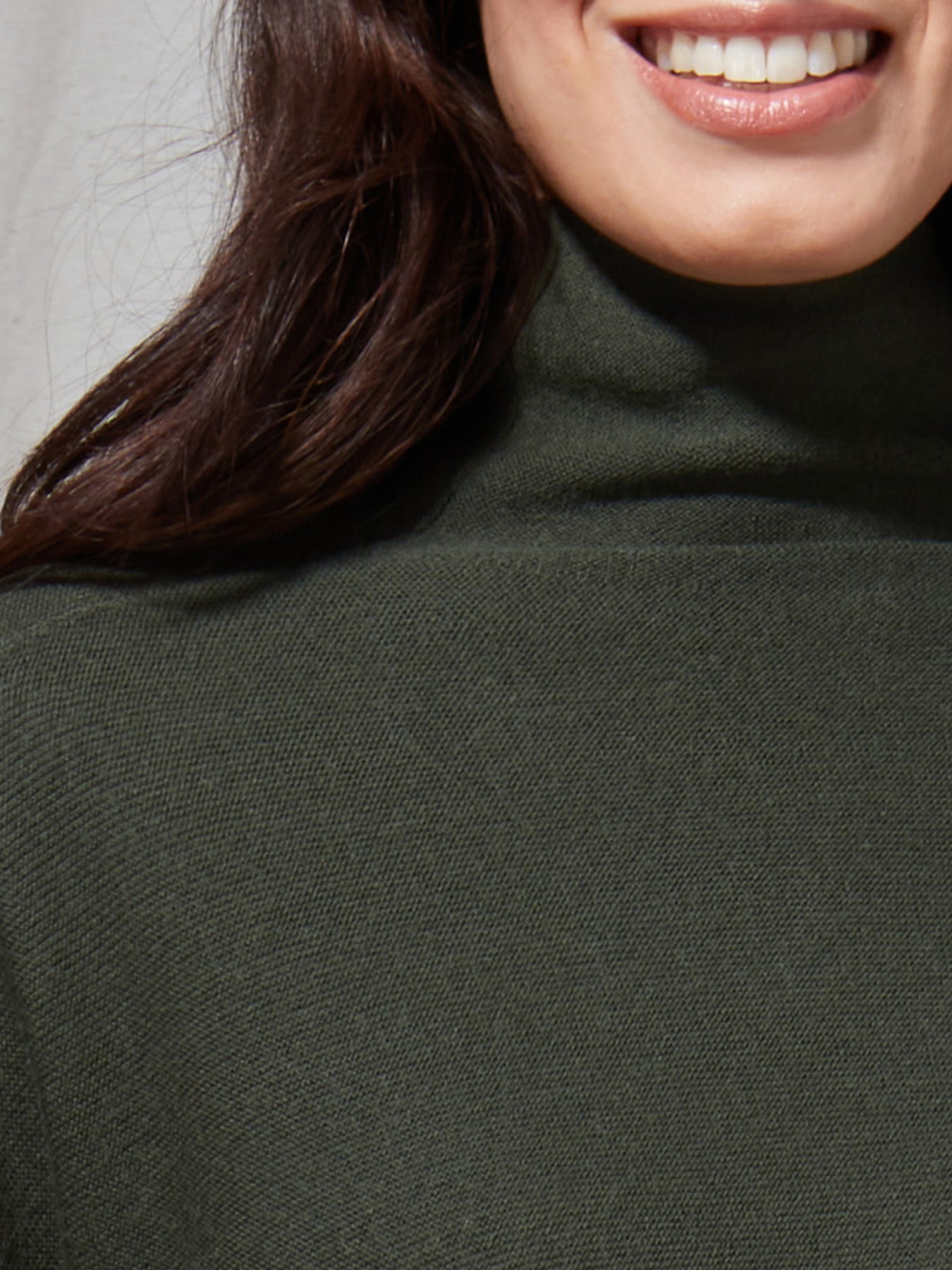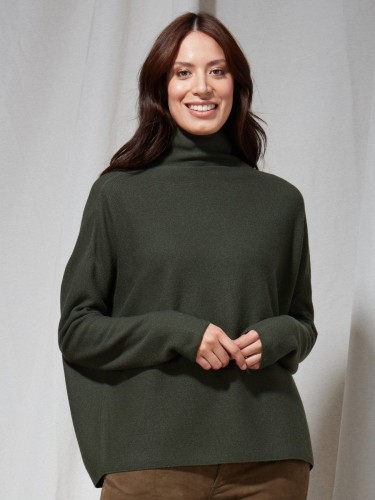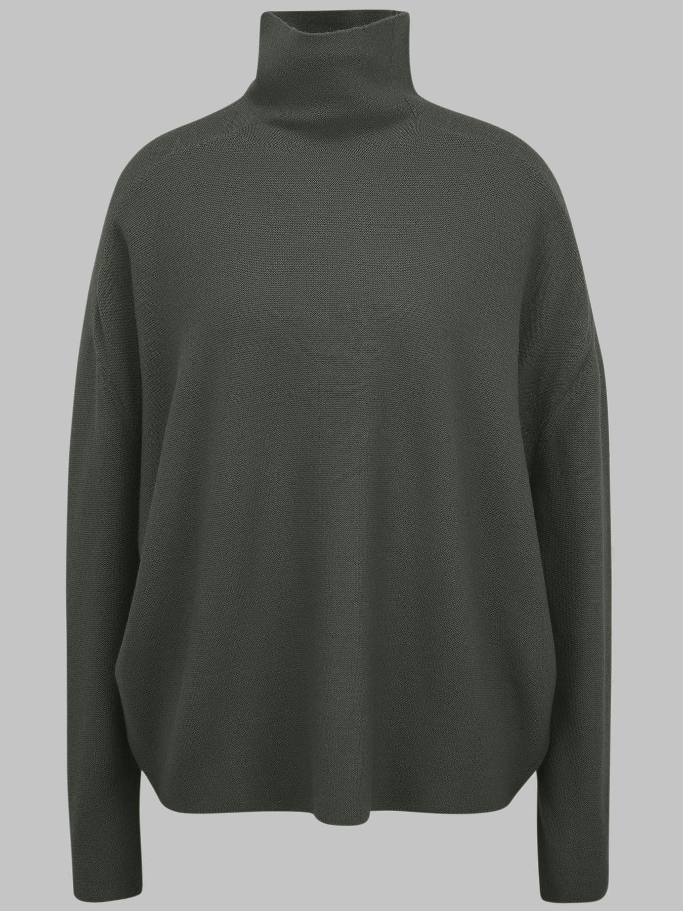 Sweter z golfem wykonany z miękkiej wełny merynosów łączy komfort z modnym stylem retro. Obszerny krój z nietoperzowymi rękawami zapewnia pełną swobodę ruchów, a delikatna, ciepła wełna gwarantuje przyjemne noszenie. Doskonale sprawdza się zarówno w zestawieniach ze spódnicą, jak i ze spodniami, stając się uniwersalnym i stylowym elementem każdej garderoby.