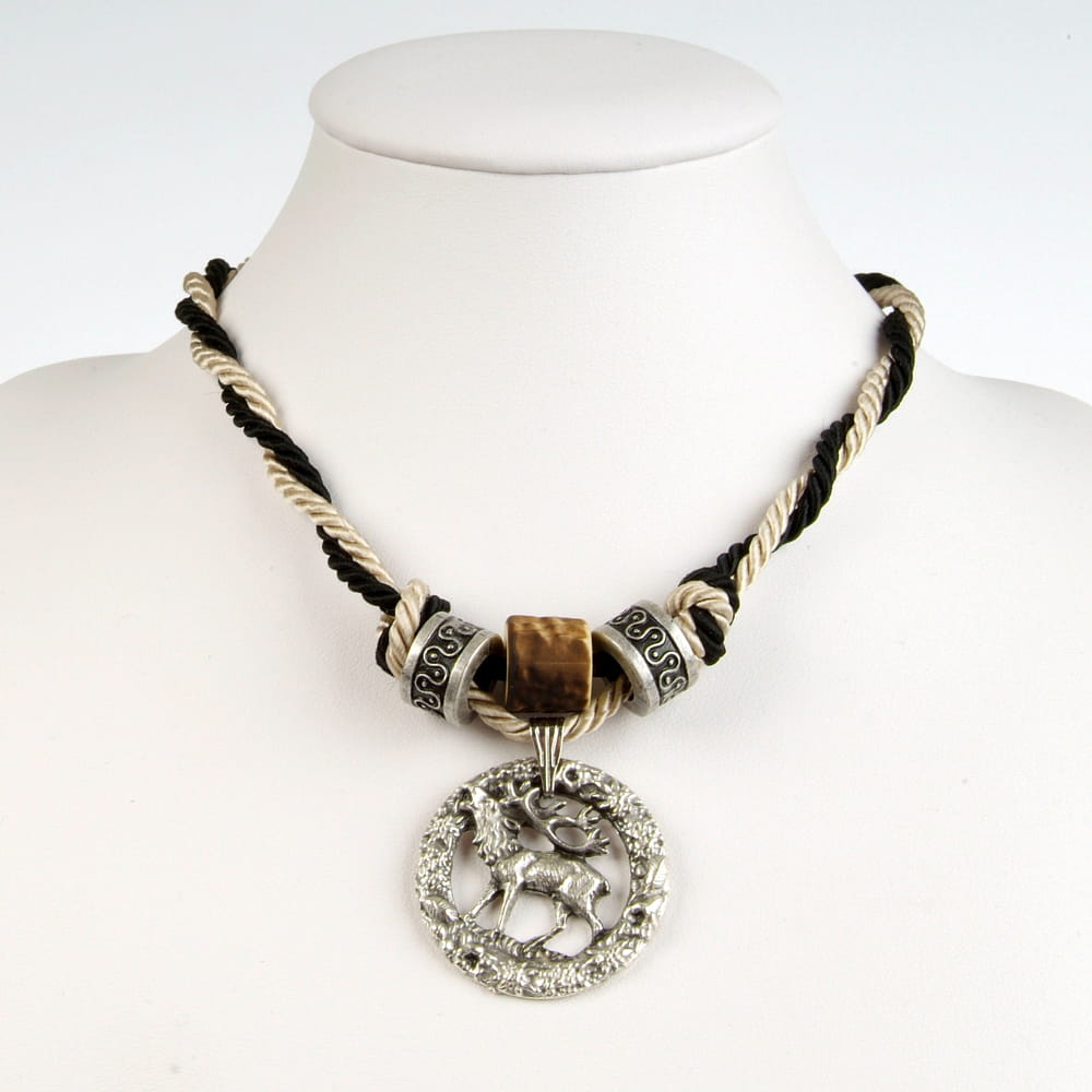 Zawieszka z jeleniem na podwójnym, skręcanym, satynowym sznurku.